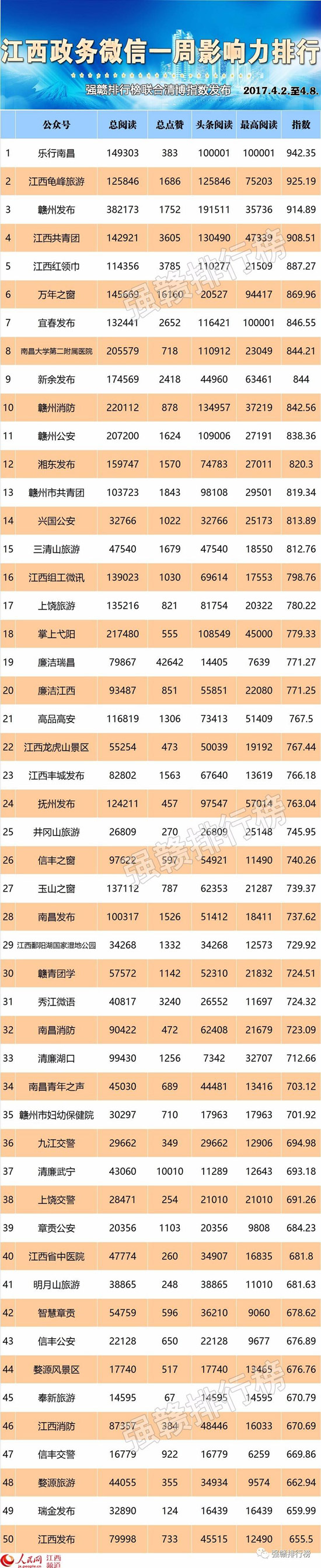 新榜前十名為:樂行南昌、江西龜峰旅遊、贛州發布、江西共青團、江西紅領巾、萬年之窗、宜春發布、南昌大學第二附屬醫院、新餘發布、贛州消防。